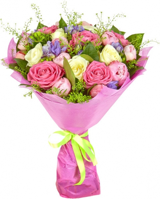 Дивный и душевный букет из нежнейших пионов и благоухающих роз - это букет-чудо, который окутает вас своим упоительным ароматом и нежностью, подарит романтическое настроение и пробудит чувственность. Такой букет прекрасно подойдет для романтического свидания с девушкой, для подарка любимой жене и дочери, а также он замечательно украсит любое торжество.