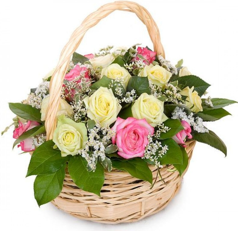 12 белых роз, 7 розовых роз, лимониум, салал, оазис, корзина16 белых роз, 9 розовых роз, лимониум, салал, оазис, корзина